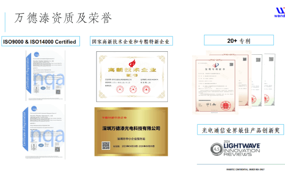 ??????深圳萬德溙光電科技有限公司(以下簡稱“萬德溙光電”)是露笑科技旗下子公司,是公司銅纜高速連接板塊的重要成員。萬德溙光電系由高速互連行業(yè)的前沿技術專家及資深管理人員發(fā)起成立,立足業(yè)界前沿的100G/200G/400G/800G/1.6T光電高速互連元器件的先進技術,是一家定位全球化的通信行業(yè)零部件公司。公司先后于2021年和2023年被評定為“國家高新技術企業(yè)”、“深圳專精特新企業(yè)”。